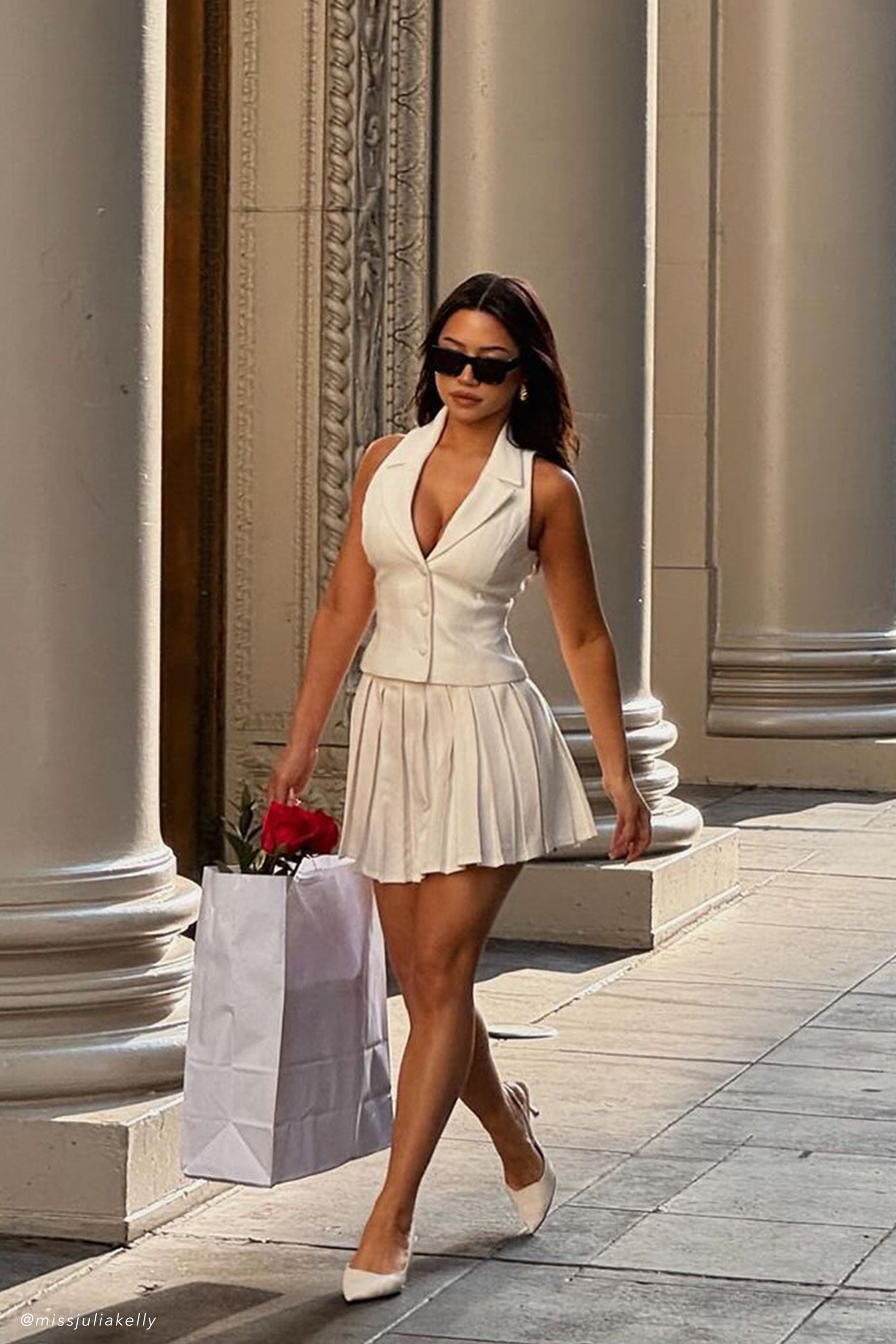 Sharp. Chic. Serene.Strak, stijlvol en zelfverzekerd – de Vespera™ Set combineert een getailleerd vest met een geplooide high-waist rok voor een minimalistische maar krachtige look. De diepe V-hals en knoopsluiting accentueren je silhouet, terwijl de rok soepel om je heen valt voor een vrouwelijke touch.